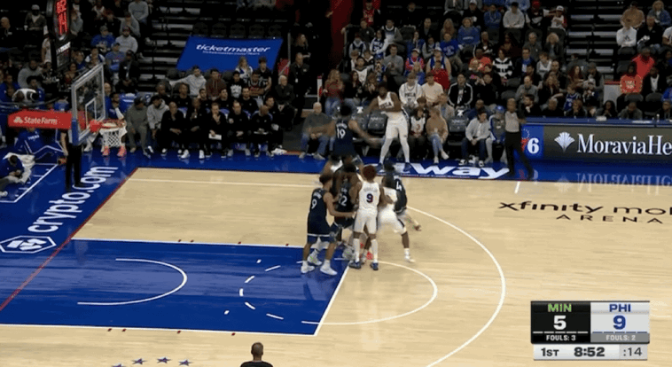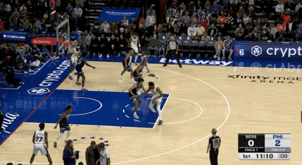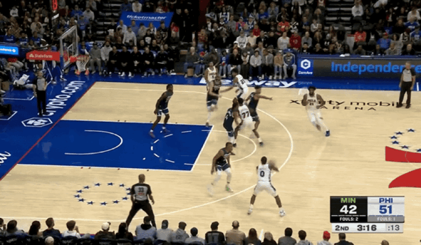 恩比德一度下场休息,他在本节还剩下3分13秒回归,并且登场顶着防守球员果断出手有三分贡献,这也是他全场的首次三分命中。随后他从后场持球一条龙挑篮得手,展示全面的持球进攻能力。
