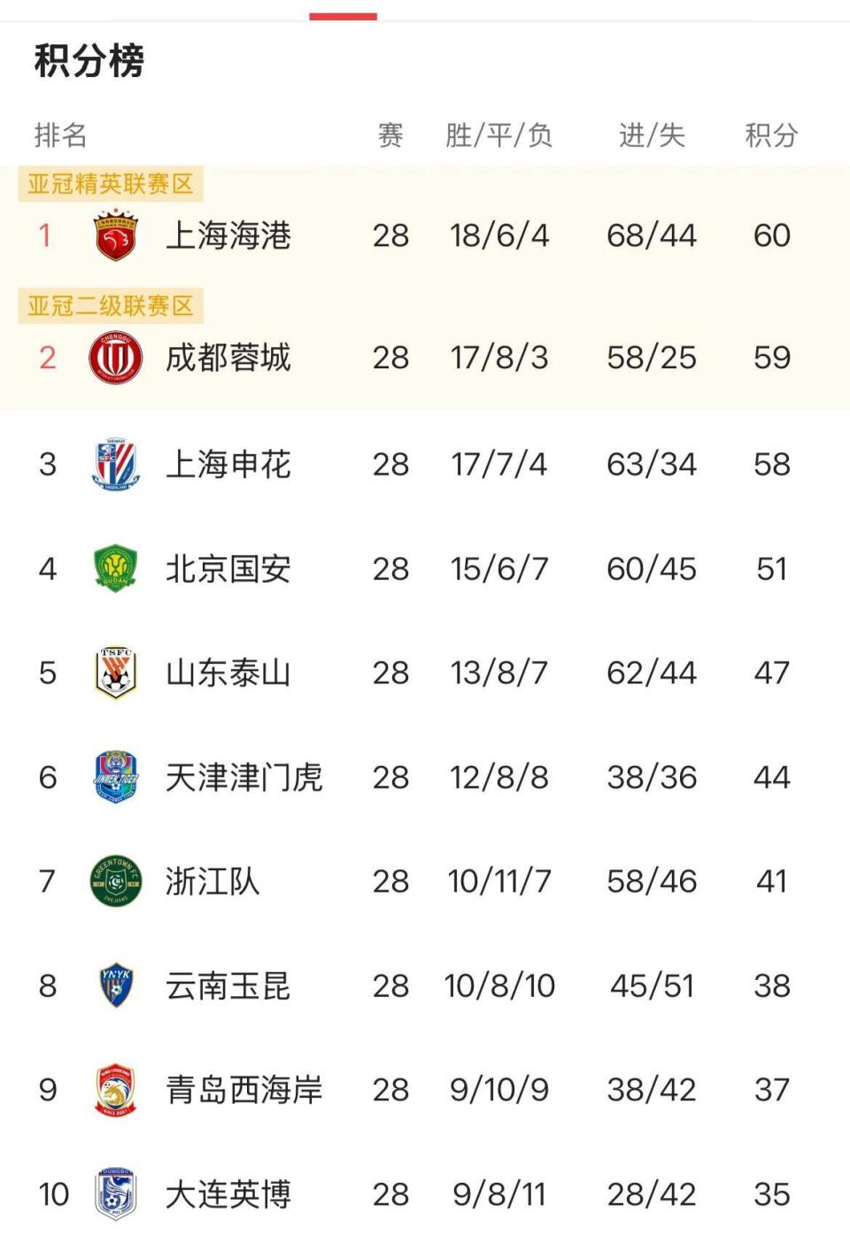 和大家一起来聊聊中超第28轮的最新积分榜情况!一句话来形容这一轮的比赛——太过于戏剧化了!中超前4名都没有赢球!而且过程是海港先1:3不敌泰山,获得反超机会的成都则仅仅2:2逼平了青岛西海岸,申花也仅仅是2:2平了大连,第4名的北京国安则是被保级的青岛海牛最后时刻4:2击败!